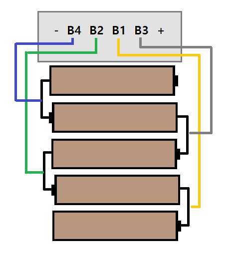 일반적인 표기법에 따라 B1은 4.2V 위치에, B2는 8.4V 위치에, B3은 12.6V 위치에, B4는 16.8V 위치에 연결하면 된다. 각 전압의 위치를 잘 모르겠으면 테스터기로 찍어서 찾으면 된다.