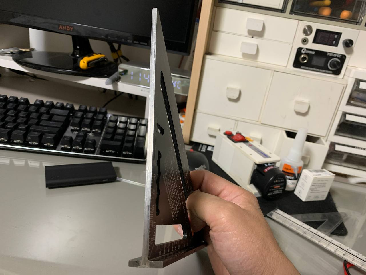 '직각자 1호'는 그리 오래 활동하지 못했다. 직각이 아니라서가 아니라 크기가 너무 작았다. 좁은 폭의 목재, 포맥스에 직각으로 선을 그을수 있었지만, 10cm이 넘는 폭의 소재에는 적합하지가 않았다. 또한 앏은 플라스틱 삼각자라서 '휘청 휘청' 대는 느낌이 있었다. 그리하여 메탈 소재의 직각자를 구매하게 되었다.